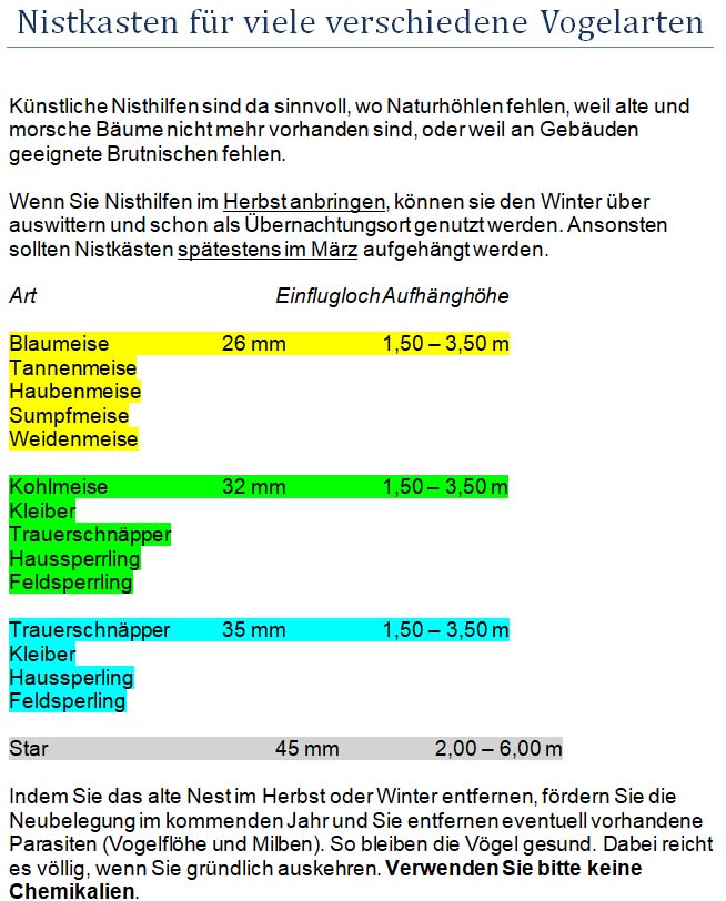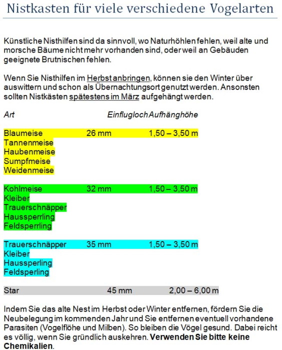 Nistkasten für Höhlenbrüter für verschiedene Vogelarten.