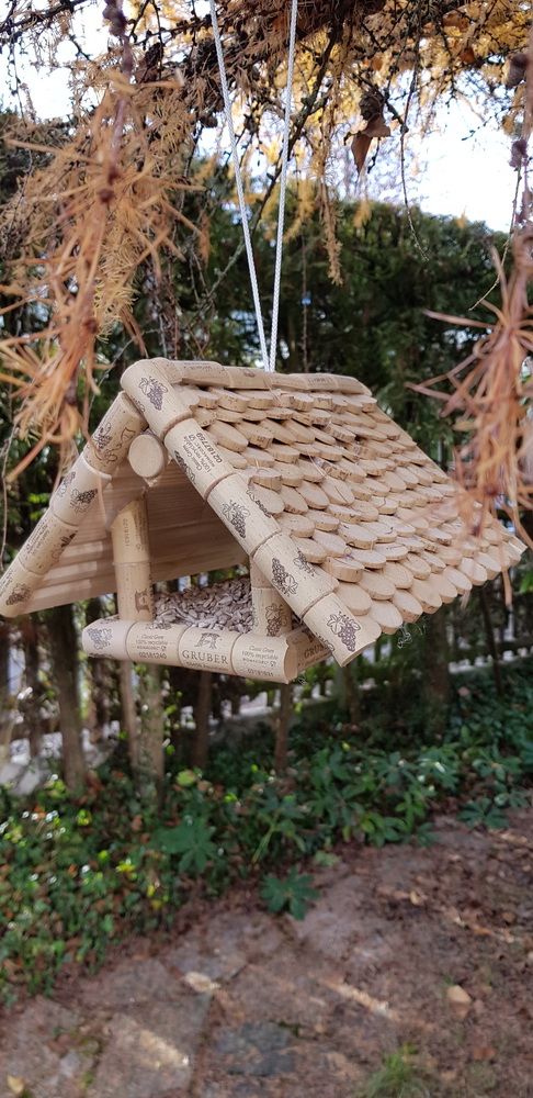 Futterhäuschen mit Korkdach zum Hängen oder Stellen.