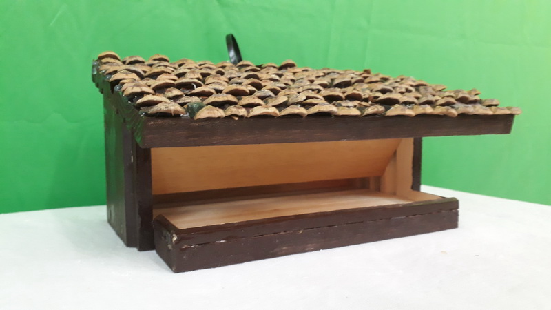 Futterhäuschen mit Dach aus den Schuppen von Kiefernzapfen zum an die Wand Hängen oder Stellen.