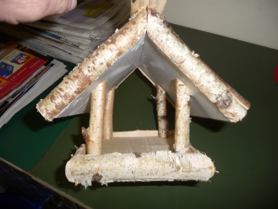 Futterhäuschen aus Halbästen aus Birke zum Hängen oder Stellen.