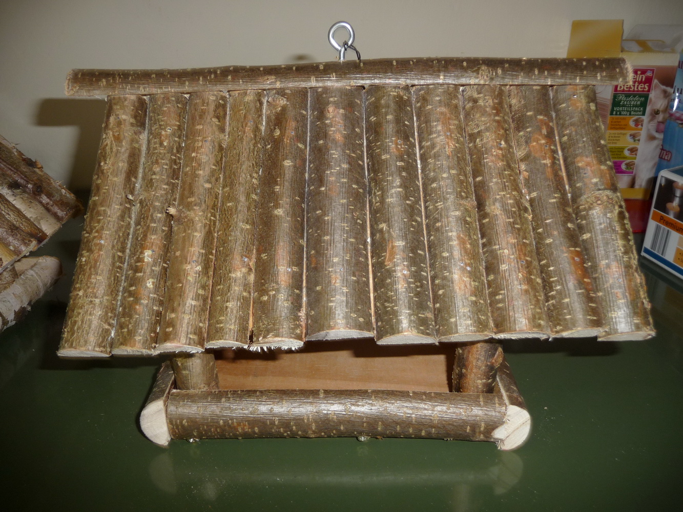Futterhäuschen aus Halbästen aus Haselnuss zum Hängen oder Stellen.