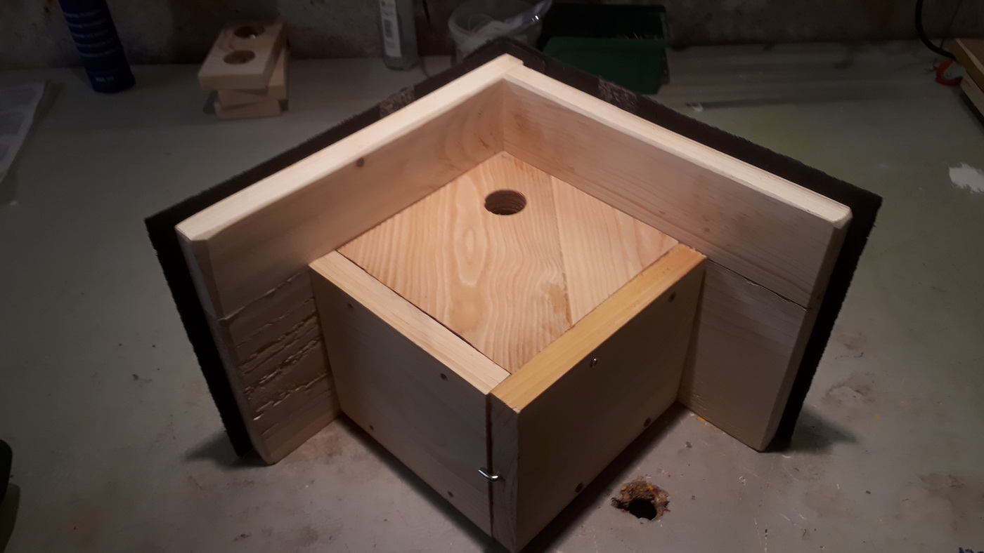 Nistkasten quadratisch zur Wandbefestigung mit Teerdach.